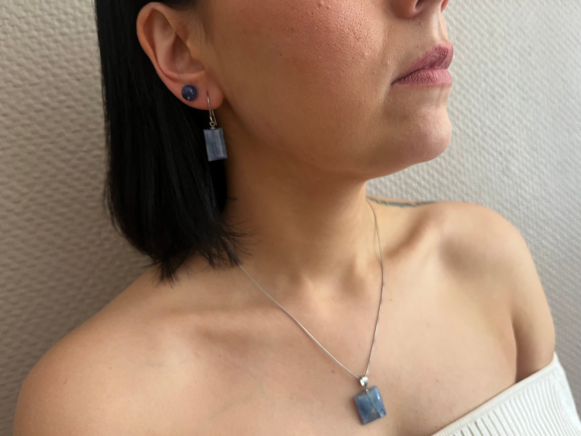 - Matériau : Cyanite bleue naturelle, une pierre précieuse aux reflets bleus profonds, taillée et polie avec soin pour mettre en valeur sa beauté et sa pureté.