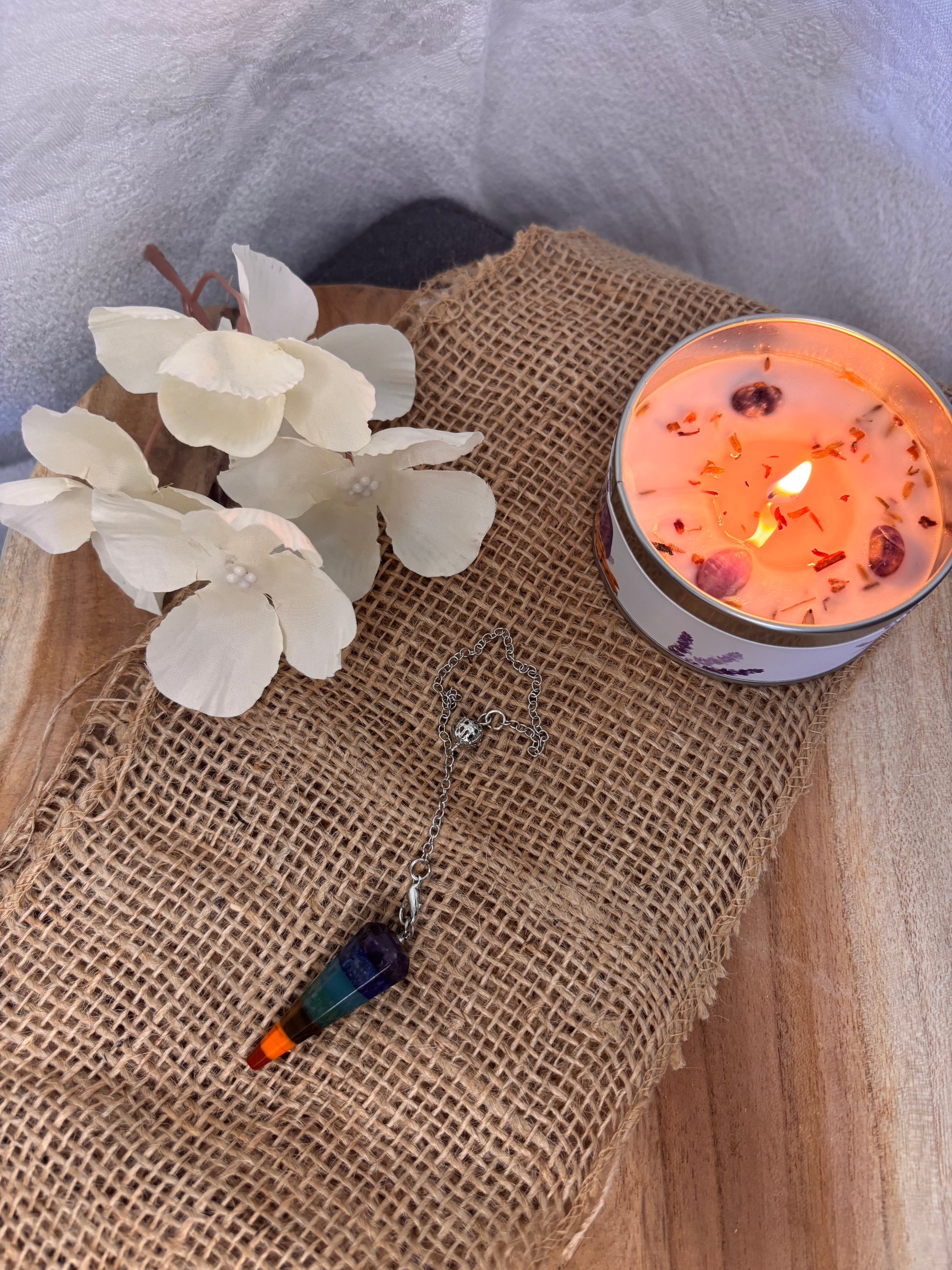 Matériaux : Le pendule est fabriqué avec des pierres naturelles aux couleurs correspondant à chaque chakra :